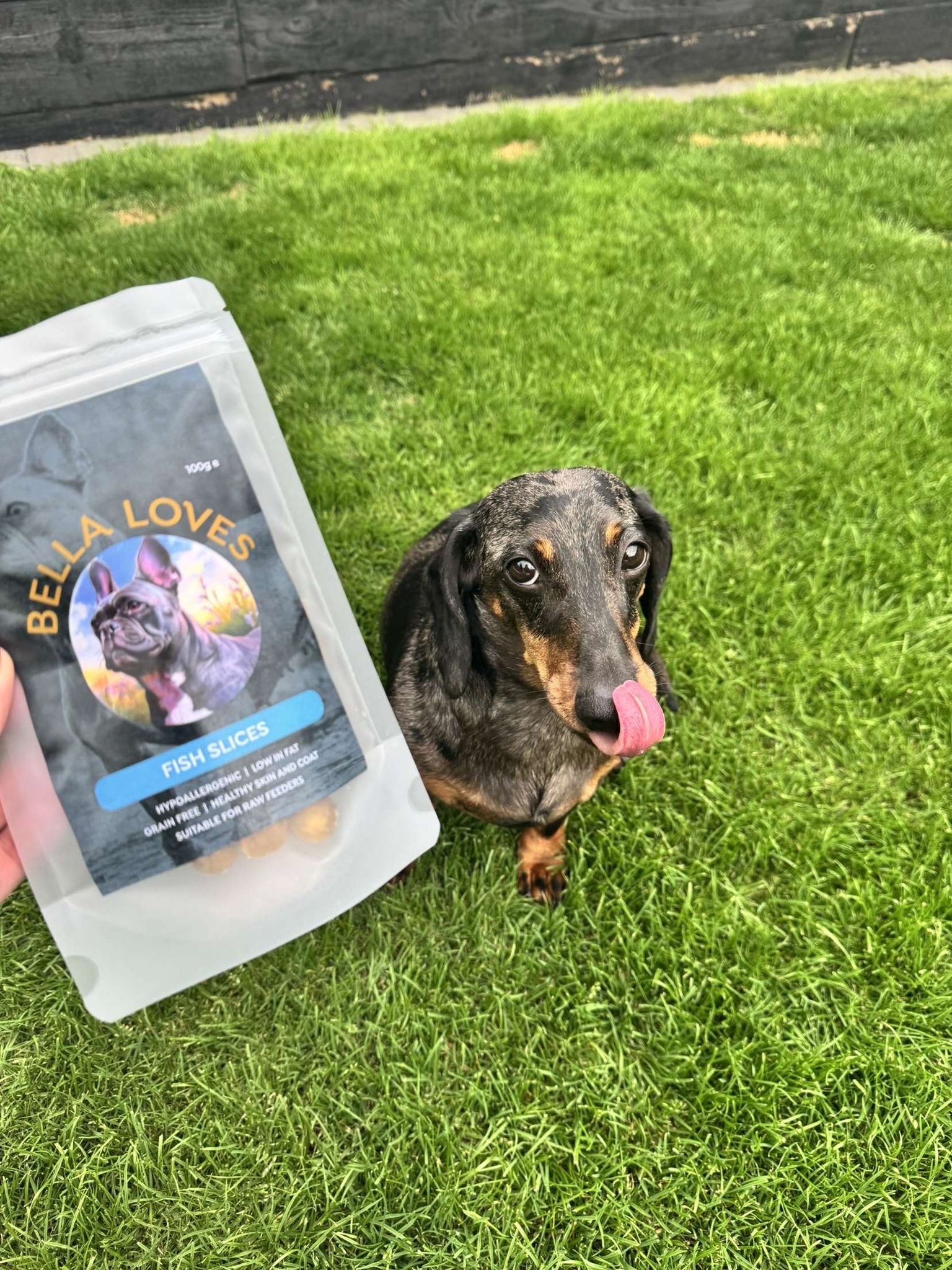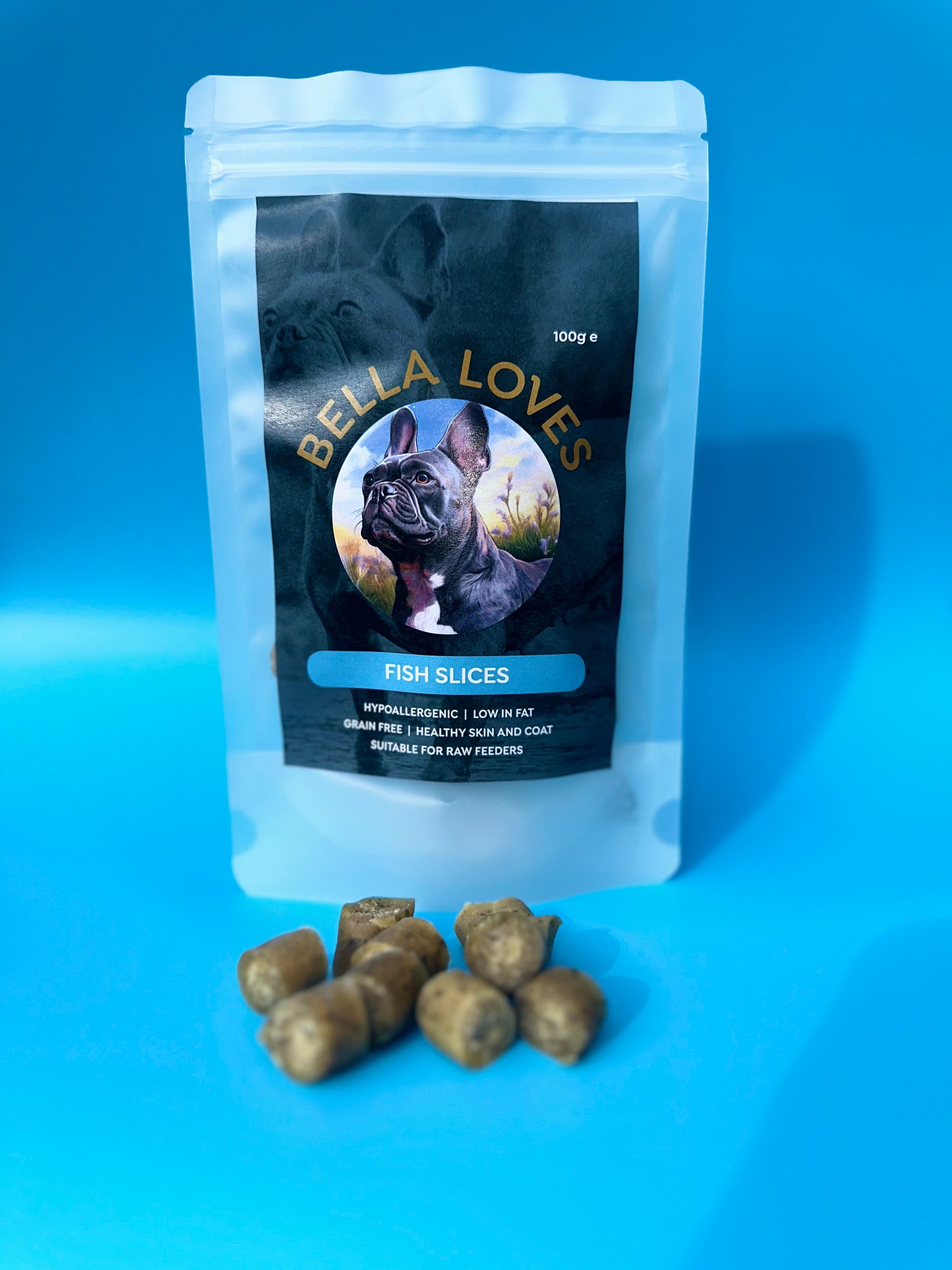 Bella Loves welcomes your furry pets to a bag full of yummy dehydrated fish slices 🐟 ! These treats are gently placed in a pouch to ensure they stay moist and fresh. Handcrafted with the finest British meats and selected fruit and veggies, these treats are perfect for your pup. Feed as a treat and feed under supervision 🐾.